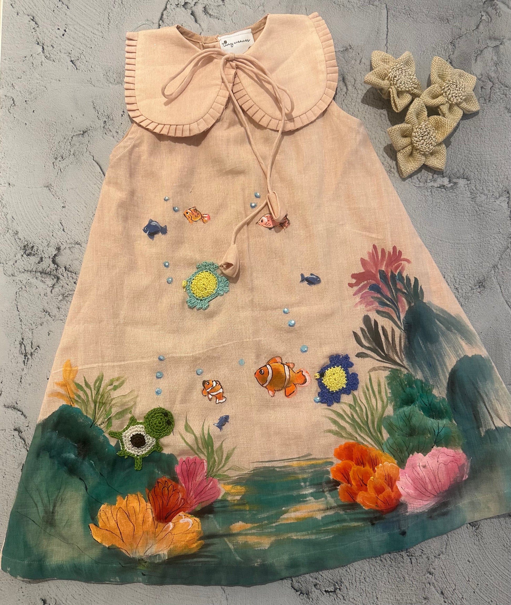 A whimsical linen cotton dress brought to life with an enchanting underwater-inspired hand-painted scene. Playful fish motifs swim across soft aquatic brushstrokes, accented with delicate hand-crocheted floral elements and subtle bead detailing. Finished with a charming scalloped collar and tie-up detail, this dress blends imagination, artistry, and comfort for a truly magical look.