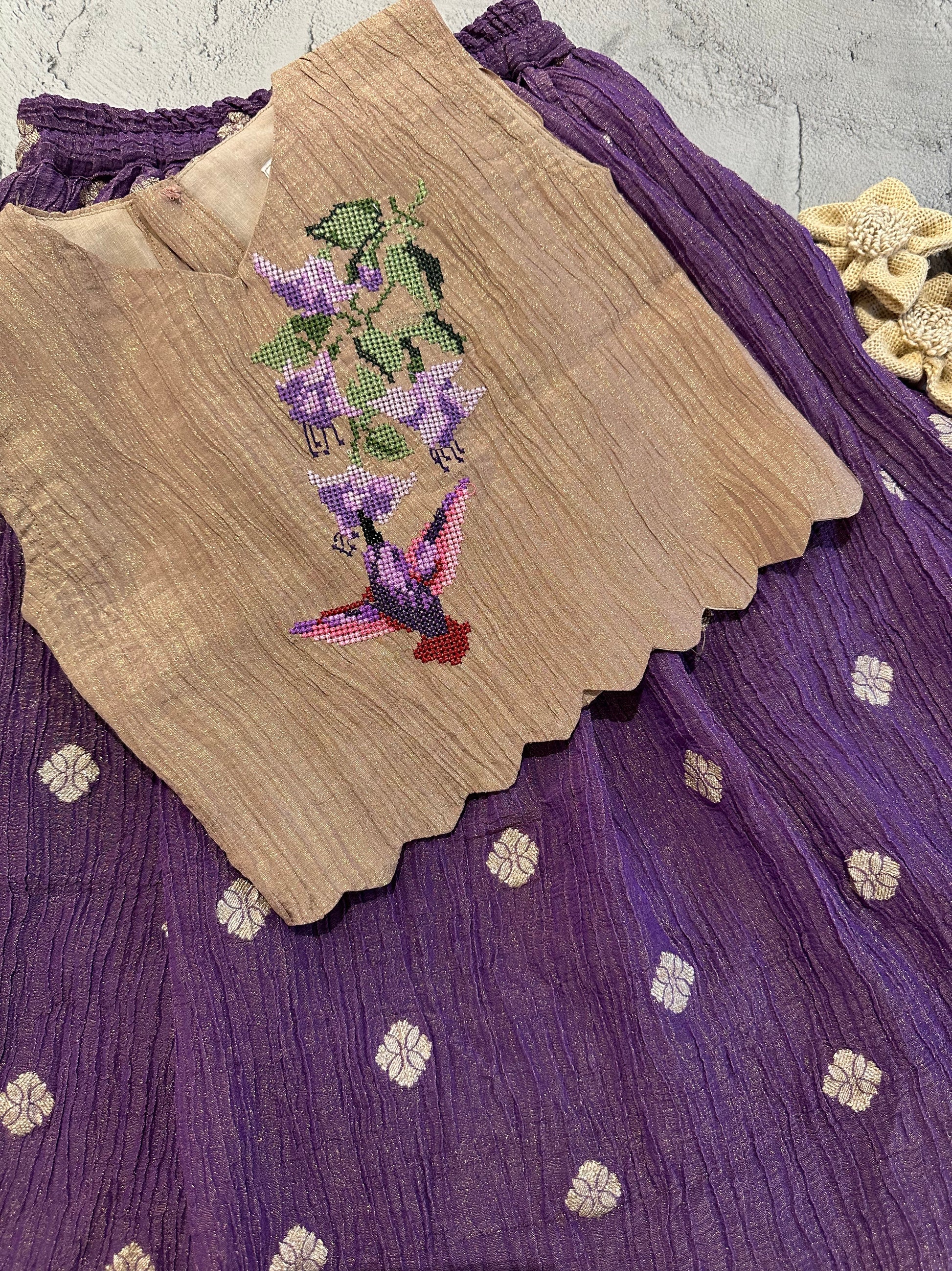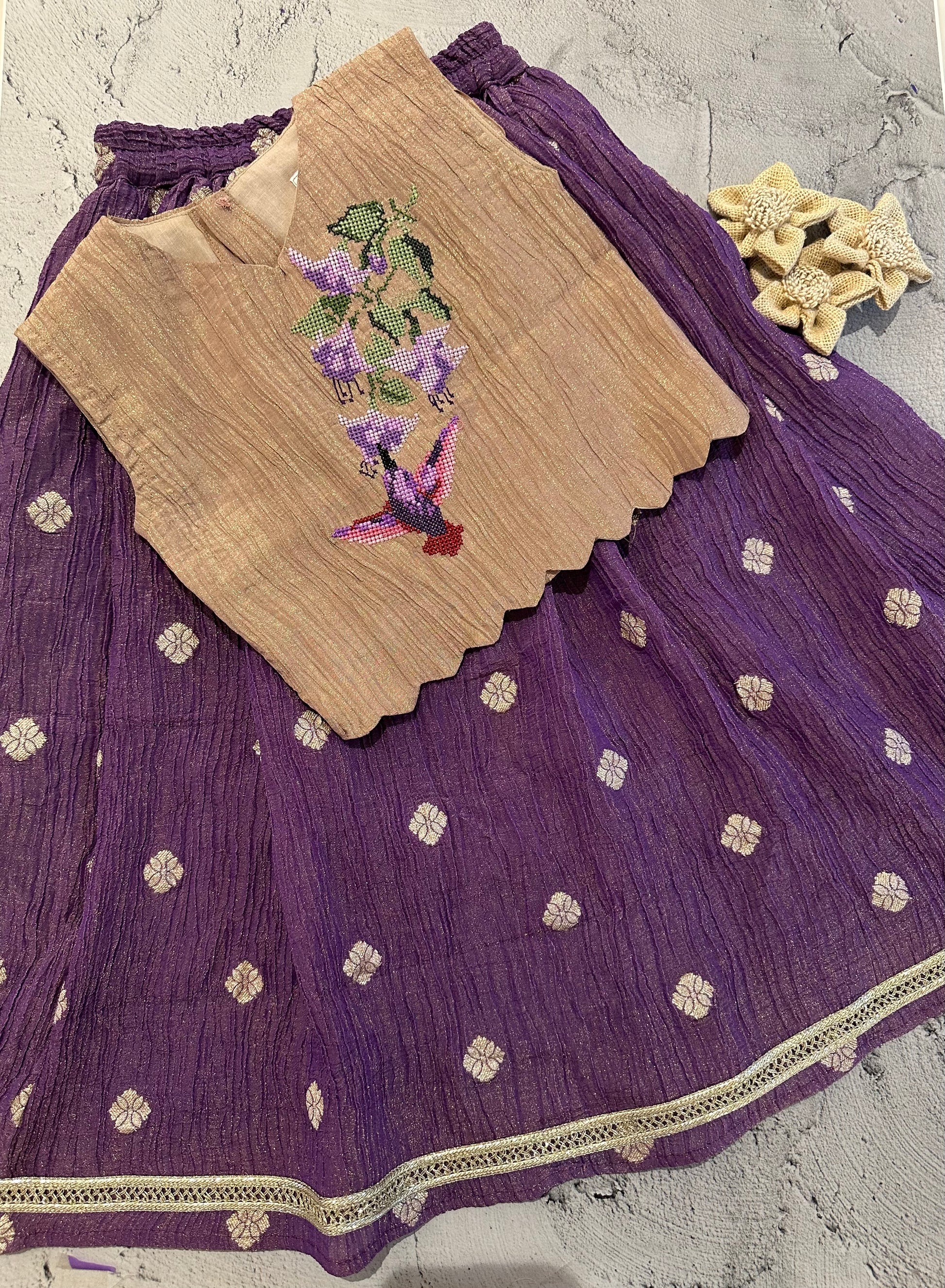A rich and graceful ensemble featuring a purple crushed butti skirt paired with a golden crushed blouse with a stylish V-neckline. The blouse is brought to life with intricate cross-stitch embroidery of hanging birds, petals, and blooming flowers, making it perfect for special occasions and celebrations.