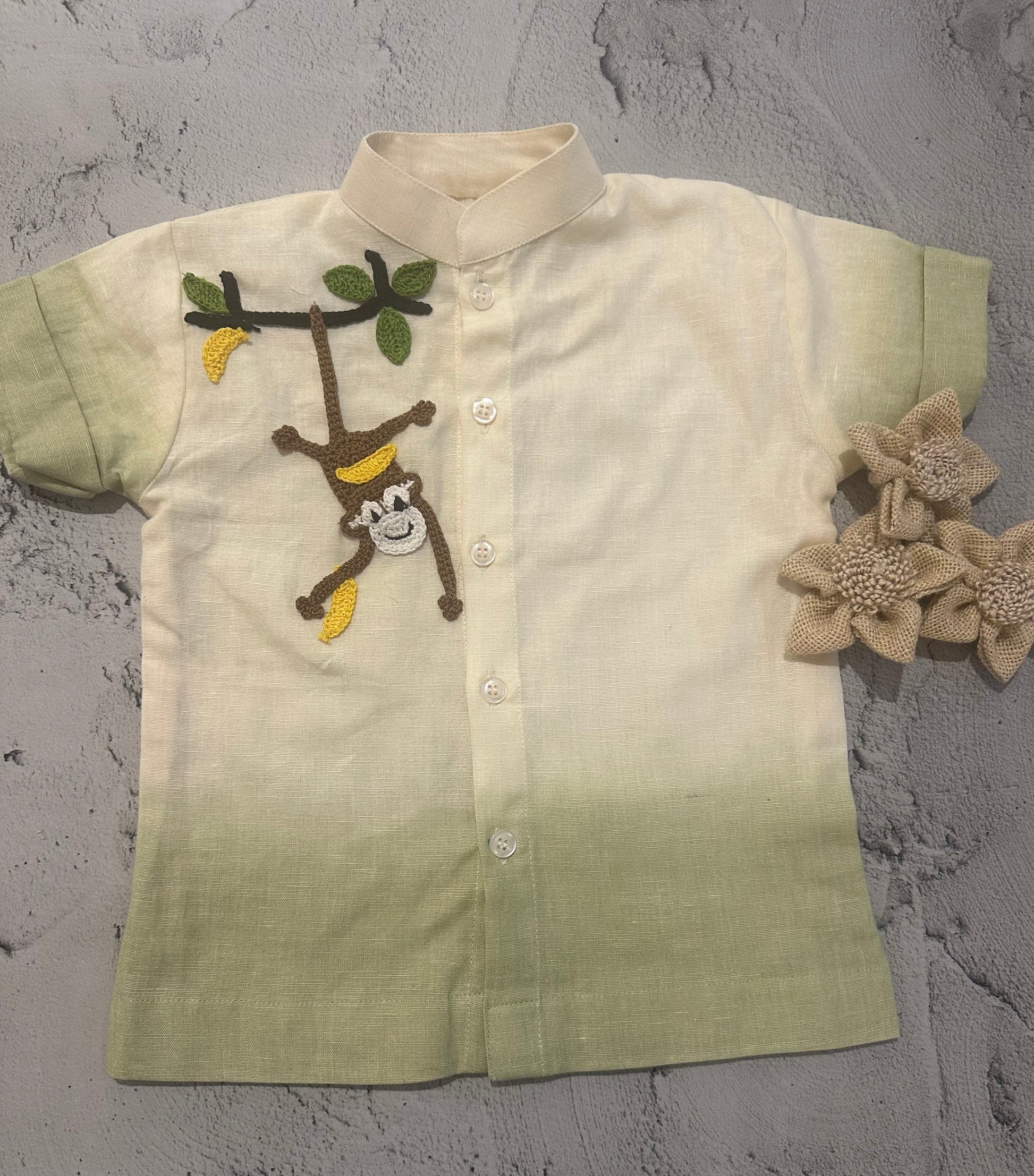 Crafted in soft cotton linen, this off-white to green ombré shirt features a playful hanging monkey crochet patch appliquéd on the shirt — a signature from our Yarn collection.
