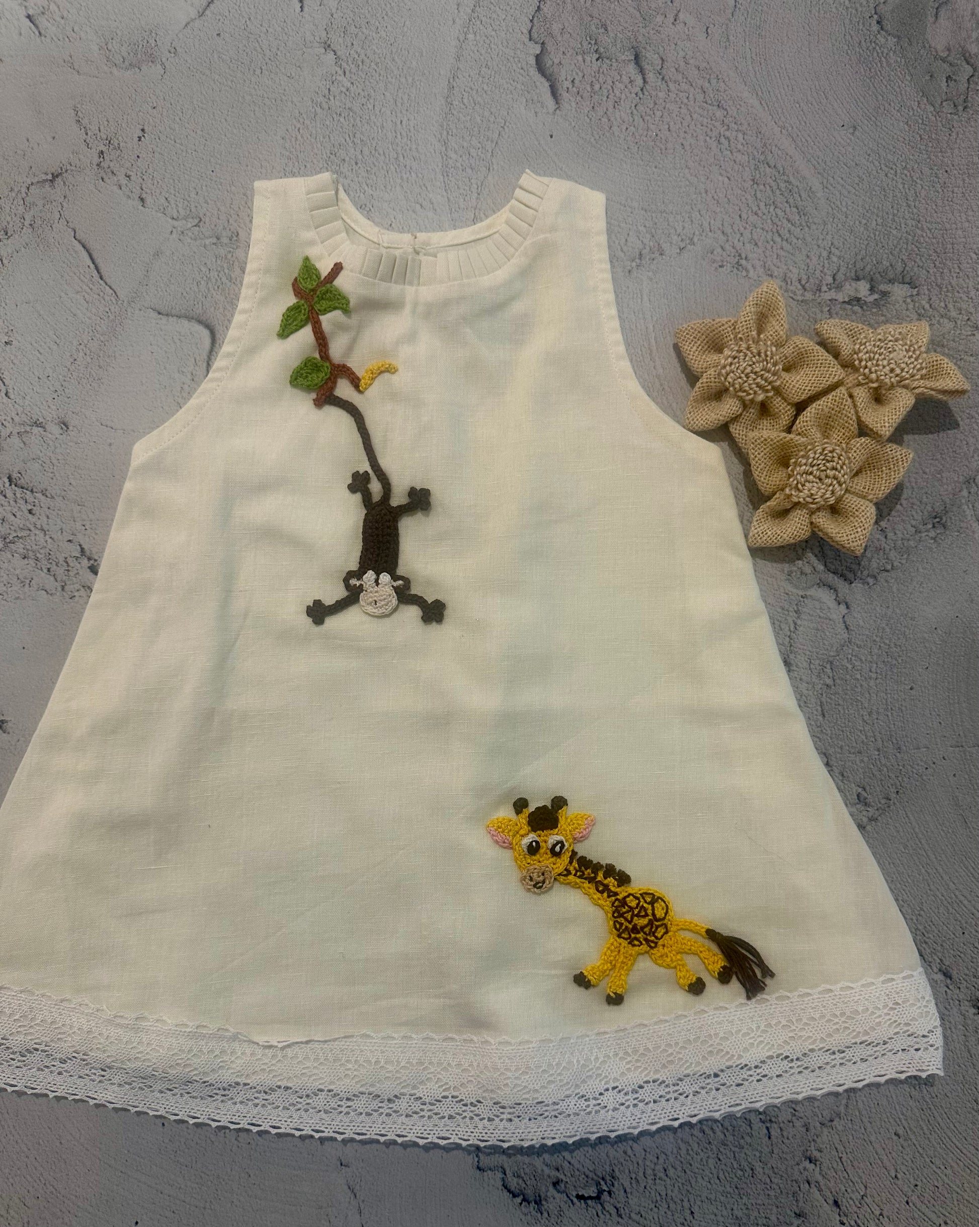 A delightful A-line dress crafted in soft handloom cotton, adorned with playful hand-crocheted safari animals. Featuring a charming giraffe and a mischievous monkey hanging from a branch, this piece brings a joyful, story-inspired charm to little wardrobes. Finished with delicate lace detailing at the hem, it’s a perfect blend of comfort, craft, and imagination.