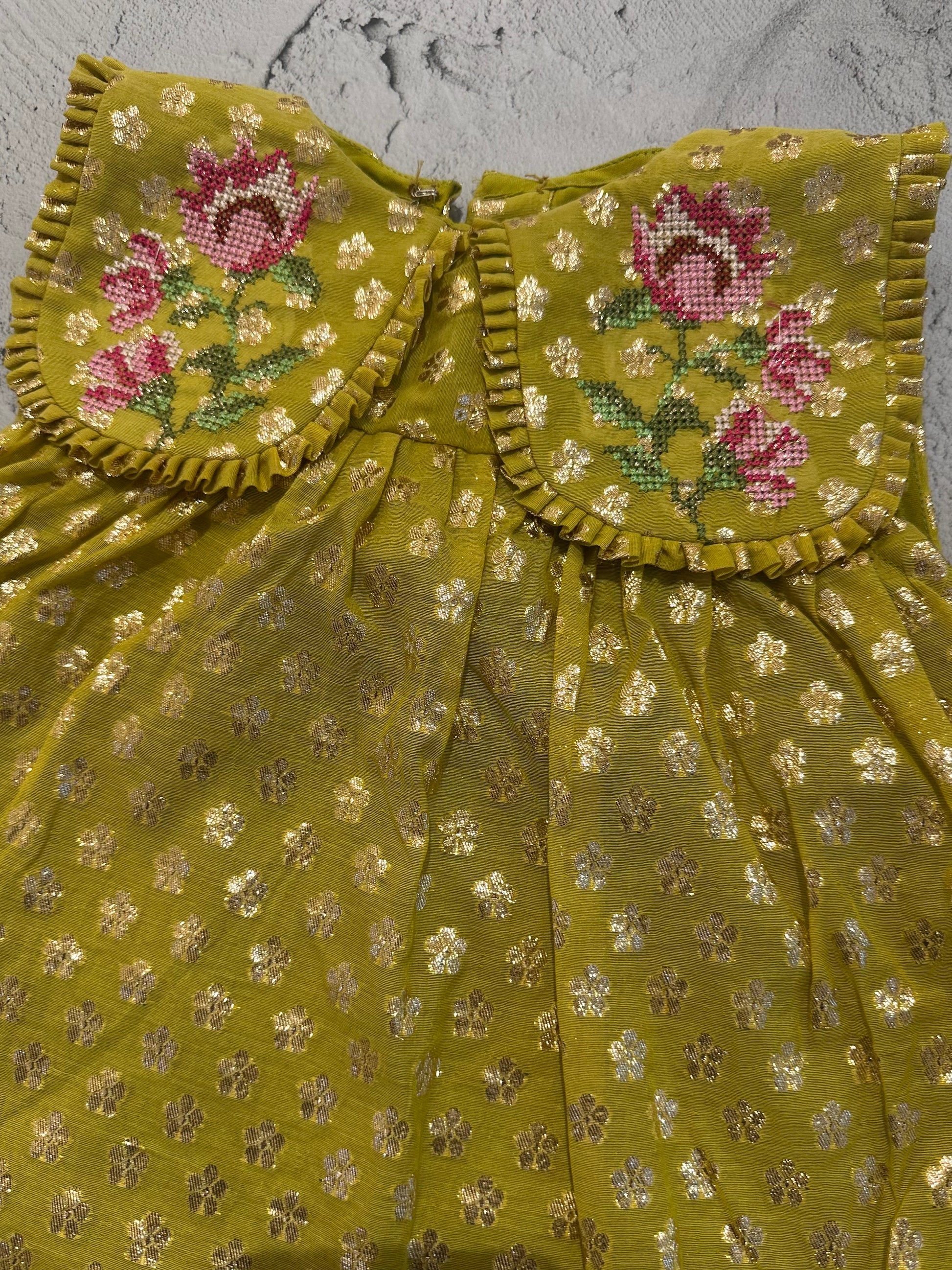 A charming A-line dress crafted in shimmering lime green Lurex Chanderi, designed with a classic Peter Pan collar that adds a vintage-inspired touch. The collar is delicately finished with soft frill detailing and adorned with intricate floral cross-stitch embroidery, bringing handcrafted elegance to the silhouette. The gentle flare and lightweight fabric make this dress perfect for festive occasions, celebrations, and special daytime events.