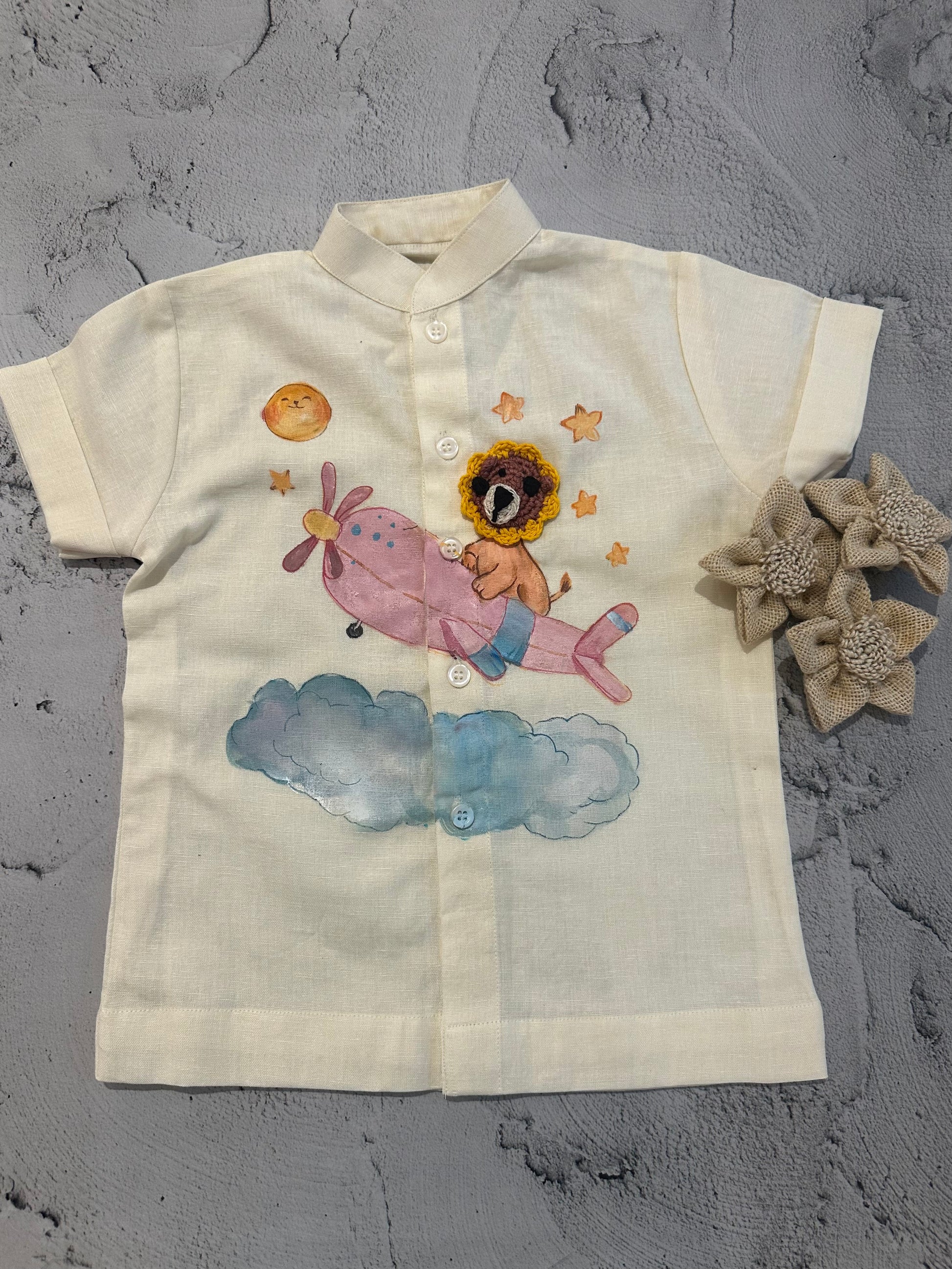 A creative blend from our Hiya and Yarn Collections, this off-white cotton linen shirt features a hand-painted aircraft scene brought to life with a charming hand-crocheted lion patch — a playful flight of imagination.