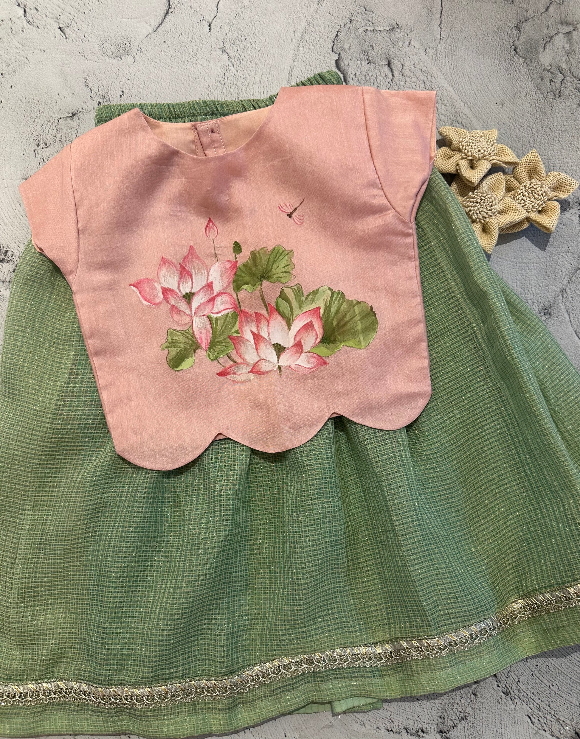 Graceful and refreshing, this Chanderi set beautifully combines traditional elegance with a soft pastel charm. The outfit features a mint green Chanderi chex skirt paired with a pink hand-painted Chanderi blouse showcasing delicate lotus motifs and a scalloped hem. The short-sleeved blouse adds a dainty finish, making it a perfect choice for festive occasions and celebrations.