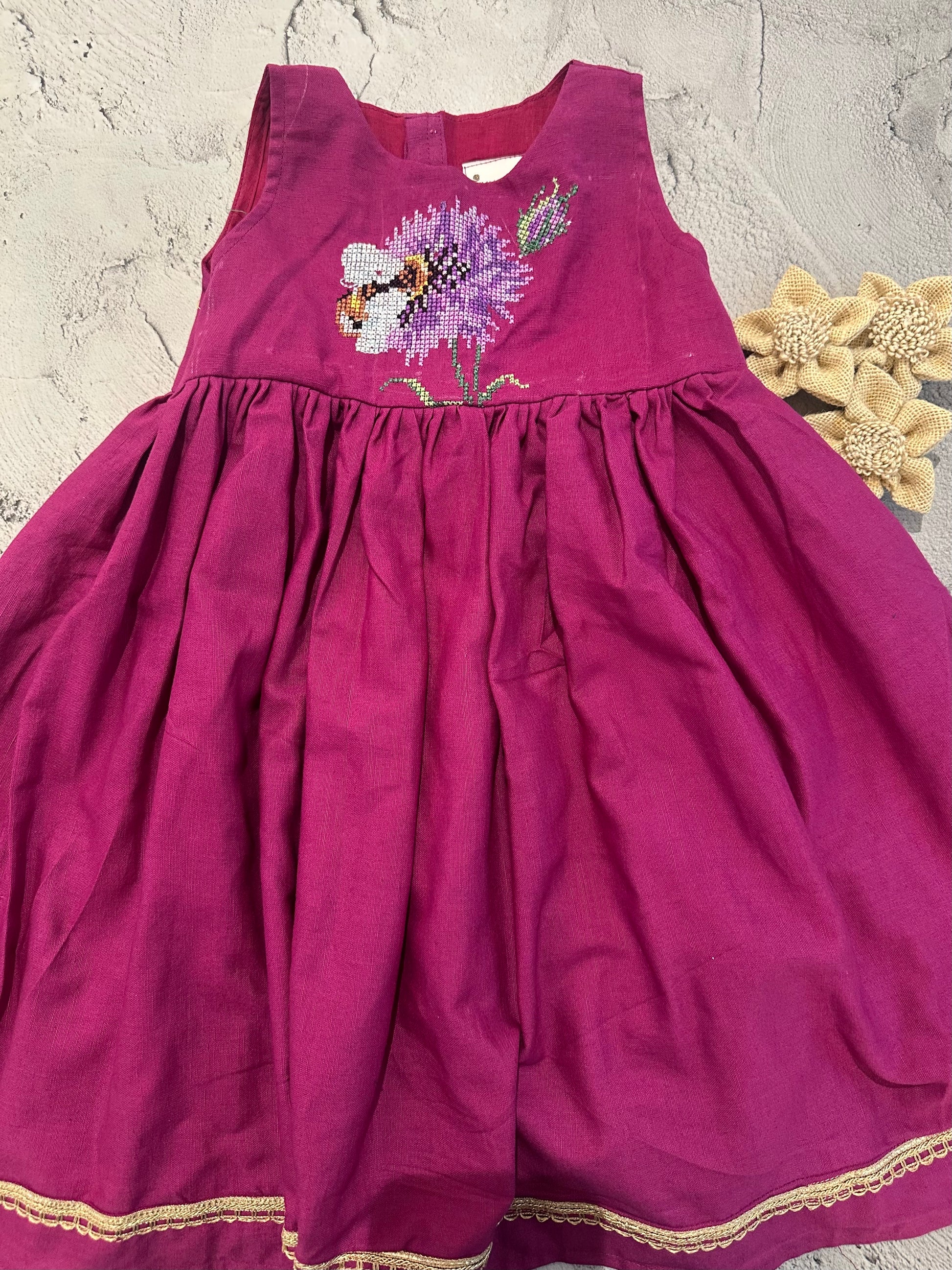 A vibrant magenta pink frock crafted in soft linen-cotton, designed for comfort with a touch of handcrafted elegance. The highlight of the dress is the delicate cross-stitch embroidery featuring a blooming floral motif with a charming little bee, placed thoughtfully on the bodice. Gentle gathers create a flowy silhouette, while a subtle lace finish at the hem adds a refined festive touch. Perfect for birthdays, celebrations, and cheerful daytime outings.