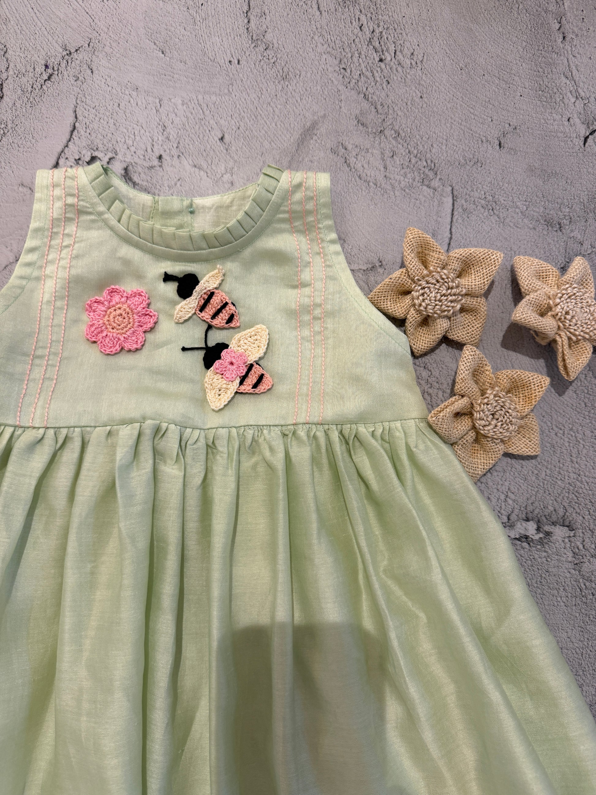 A graceful sea green Chanderi high-low frock, featuring charming bee and floral crochet patches delicately appliqued on the yoke.