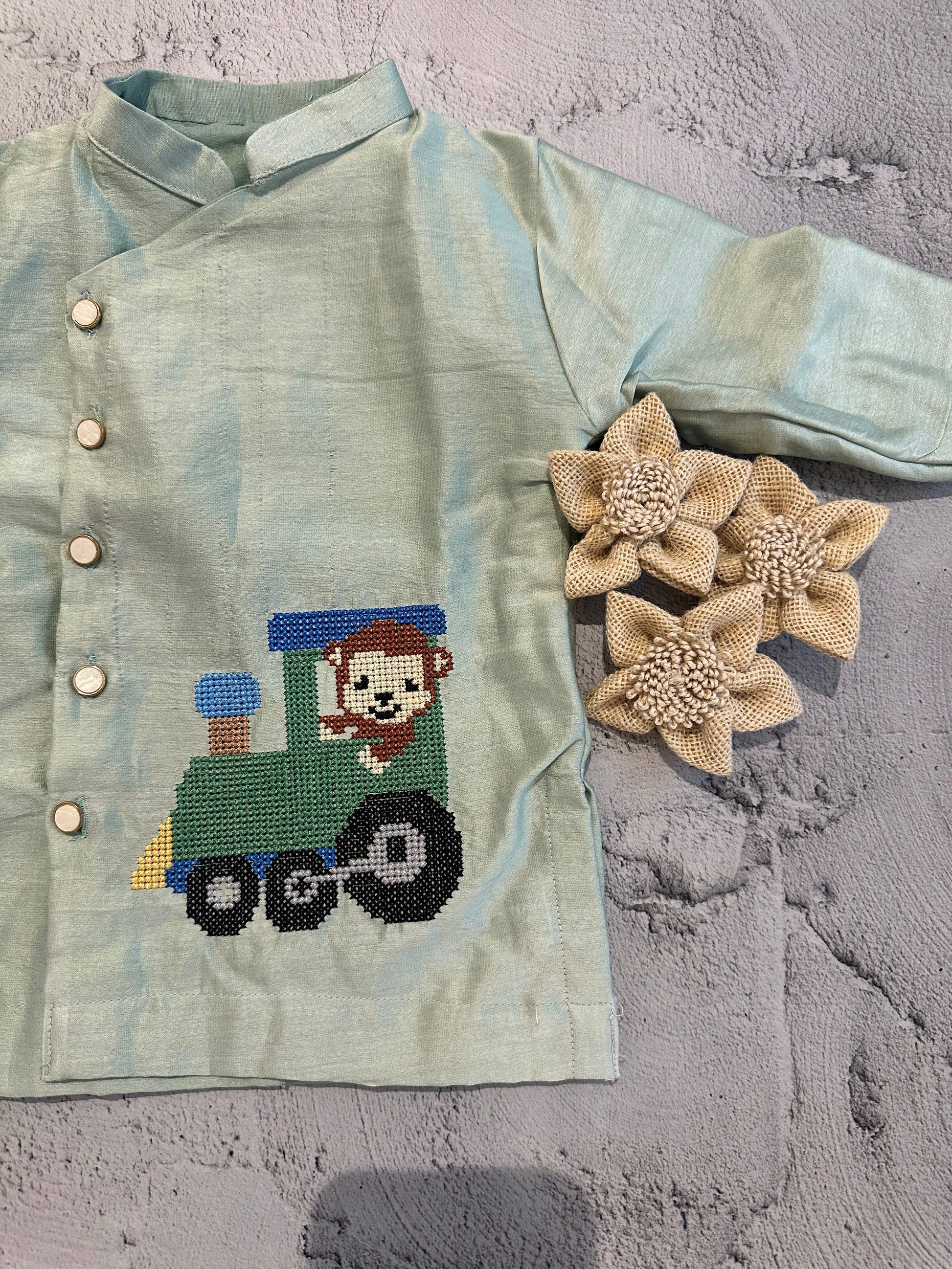 A fun and quirky mint green cross kurta featuring a delightful cross-stitch embroidery of a monkey sitting in a truck on the body of the kurta. Paired with off-white spun cotton pants, this set is perfect for adding a touch of whimsy to festive dressing.