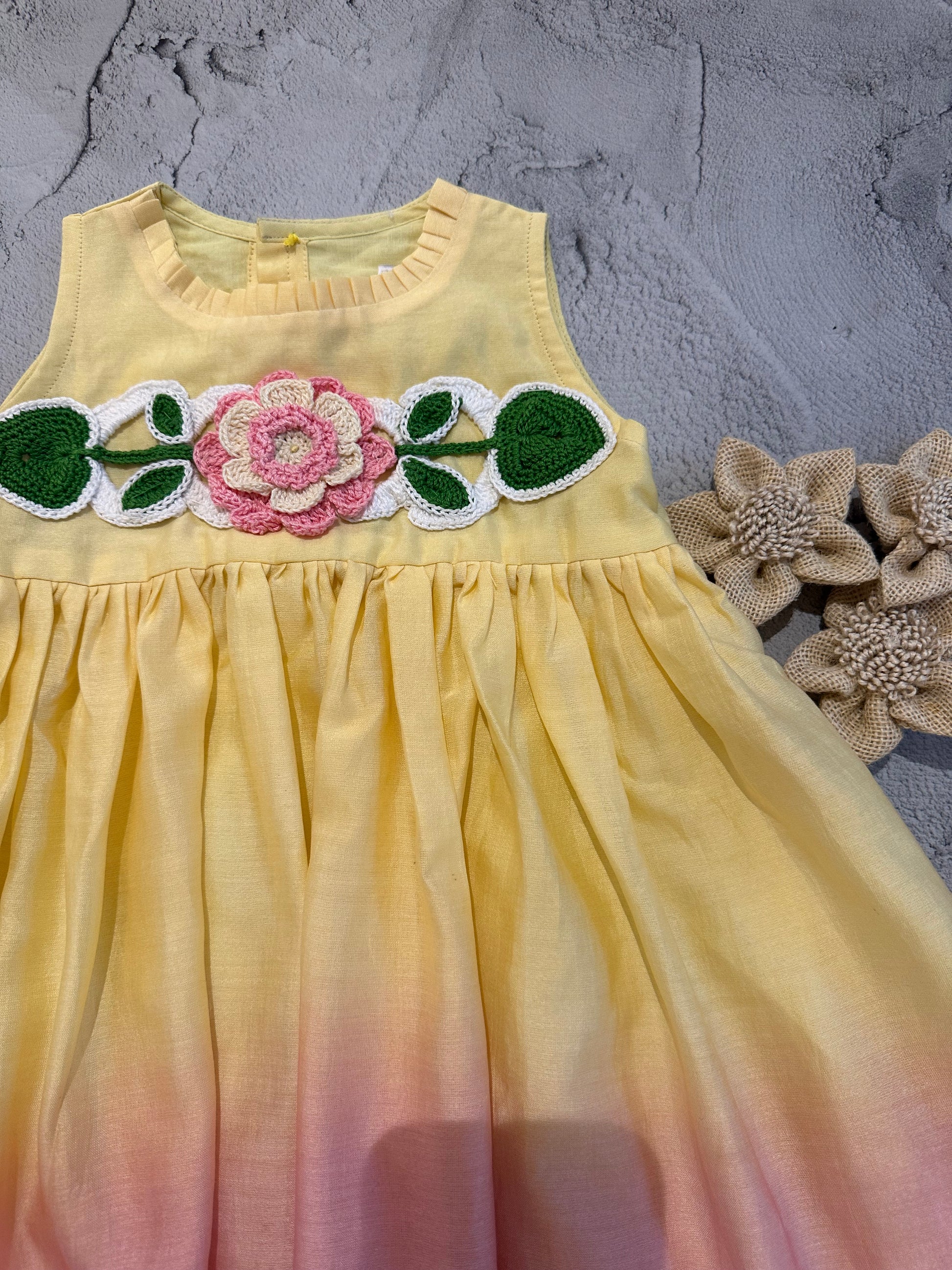 A dreamy pink and yellow ombré Chanderi dress, adorned with a hand-crocheted floral band on the yoke for a delicate handcrafted touch.