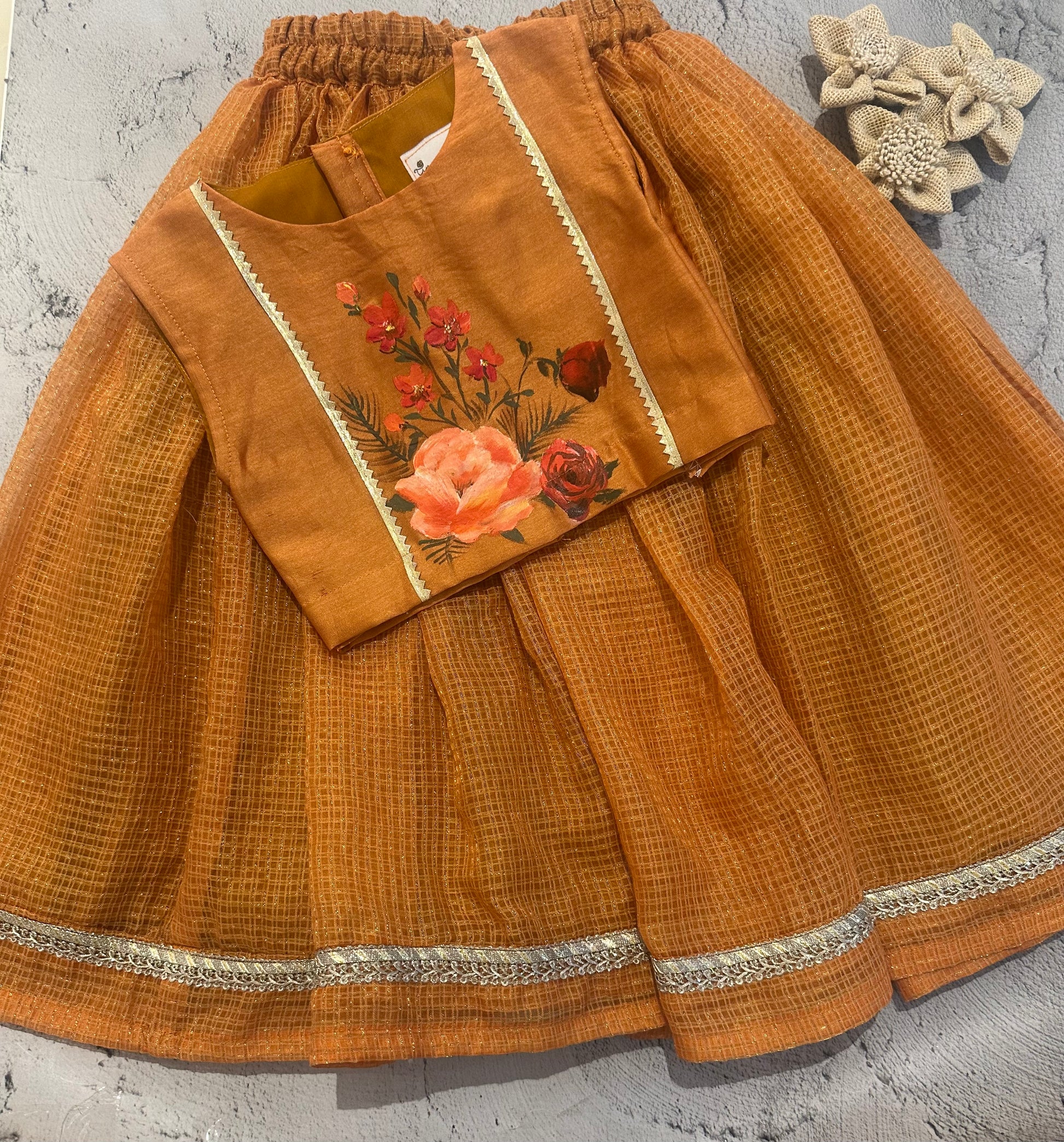 Radiating festive warmth, this elegant Chanderi set features a rich orange Chanderi checks skirt paired with a hand-painted Chanderi blouse adorned with a vibrant floral bouquet motif. The blouse is accented with delicate lace detailing, adding to its handcrafted charm. Perfect for festive occasions, weddings, or cultural celebrations, this outfit blends tradition with timeless artistry.