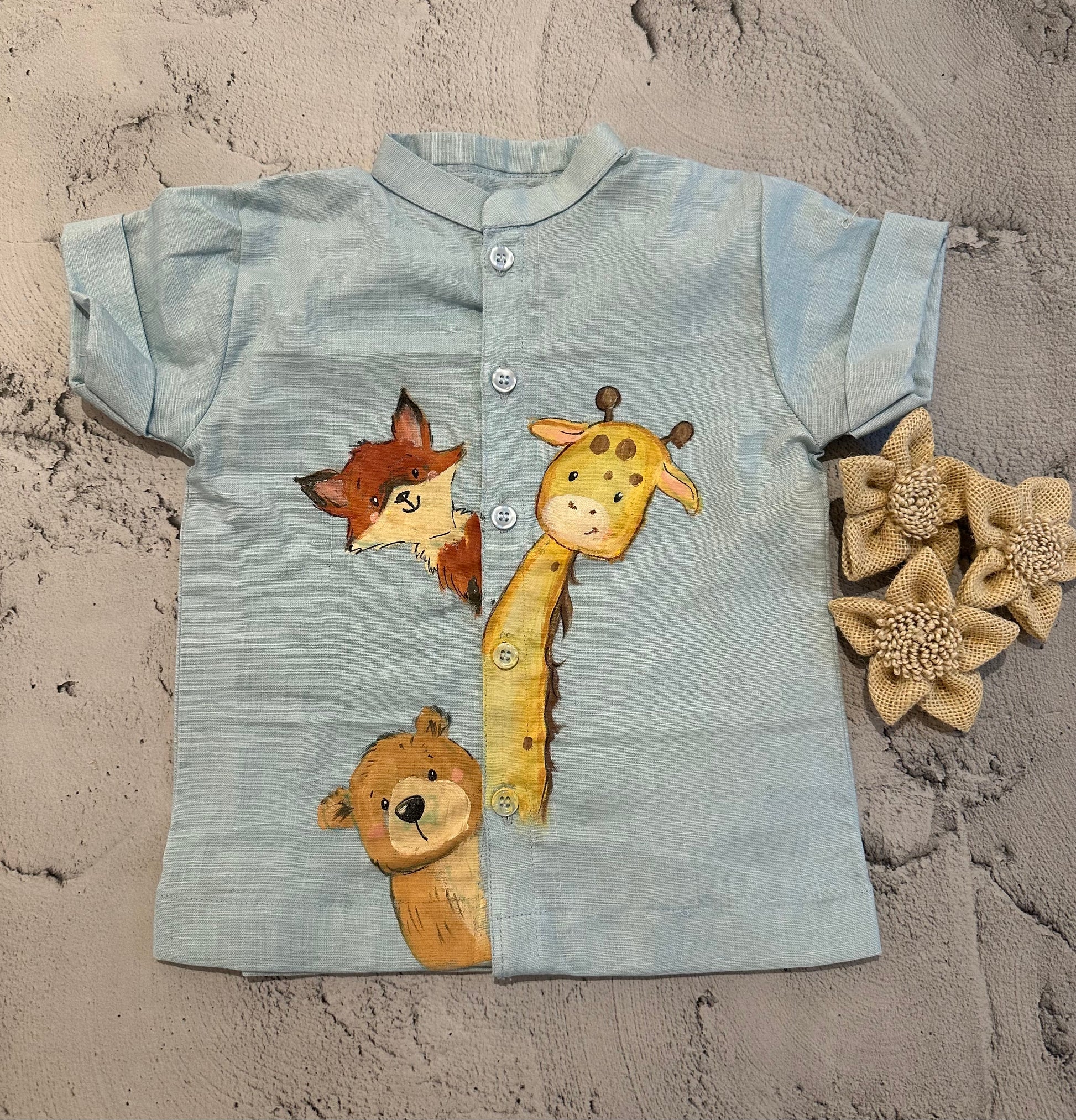 A charming blue linen-cotton shirt featuring adorable hand-painted animals peeking from either side. Playful and festive, this shirt adds a delightful storybook touch to any little one’s wardrobe.