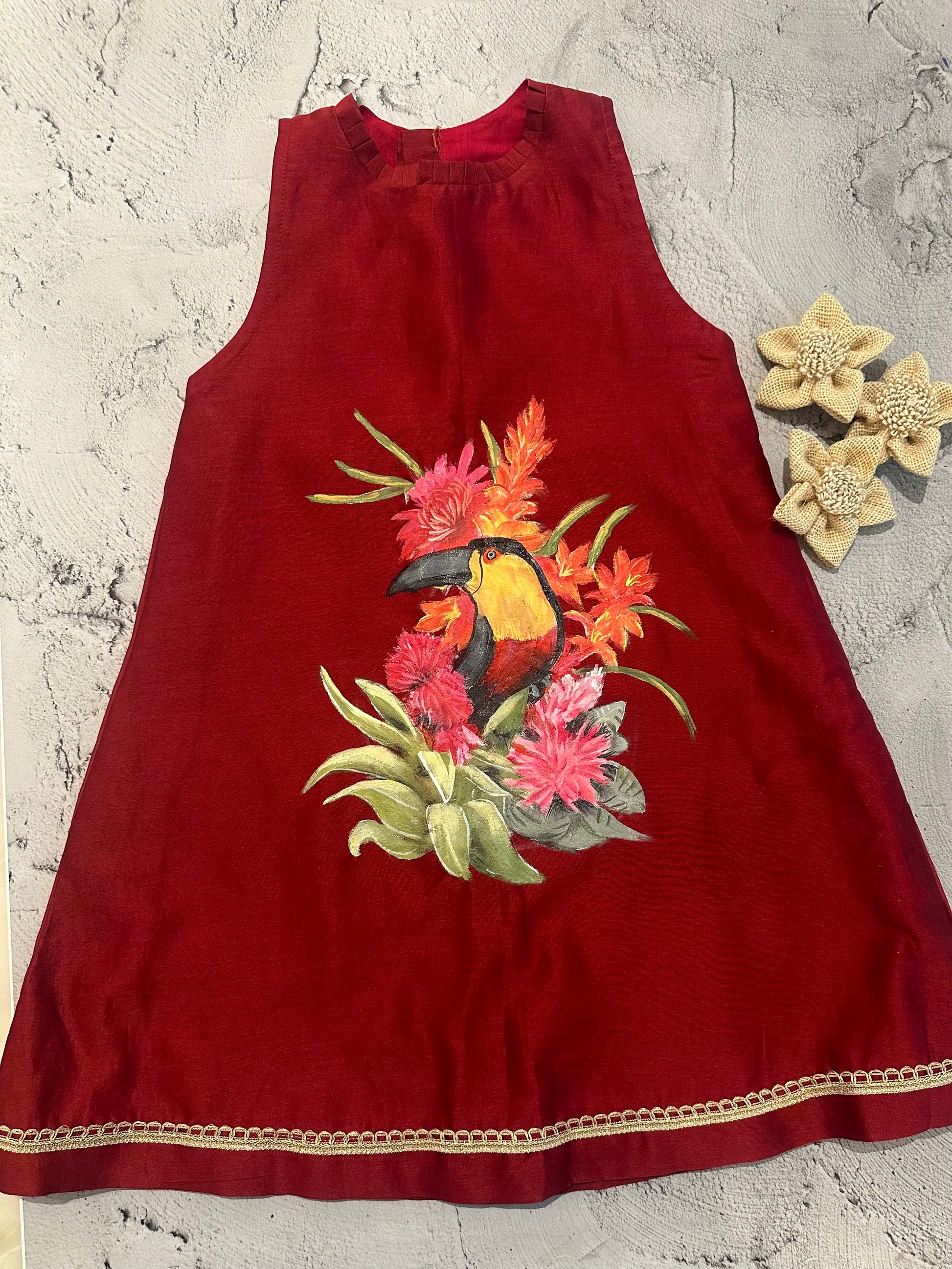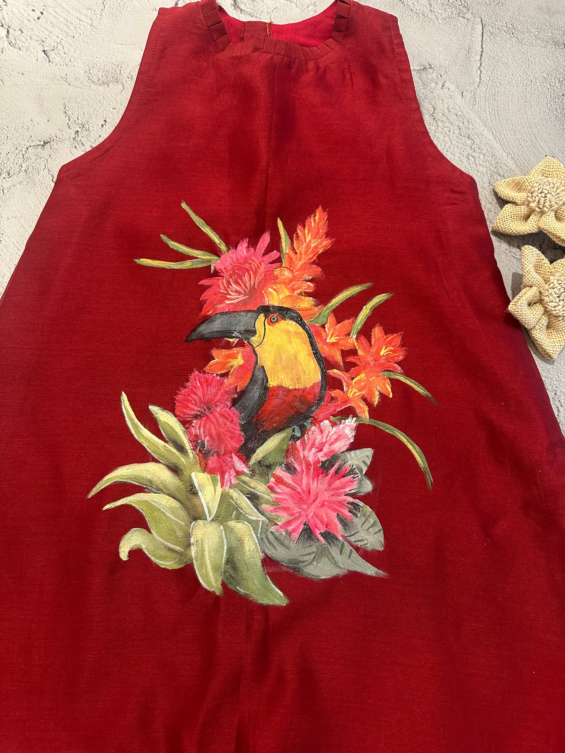A striking A-line frock crafted in rich red Chanderi, featuring a vivid hand-painted tropical scene. At the heart of the artwork sits a graceful toucan nestled among blooming florals and lush foliage, creating a bold yet elegant statement inspired by nature.