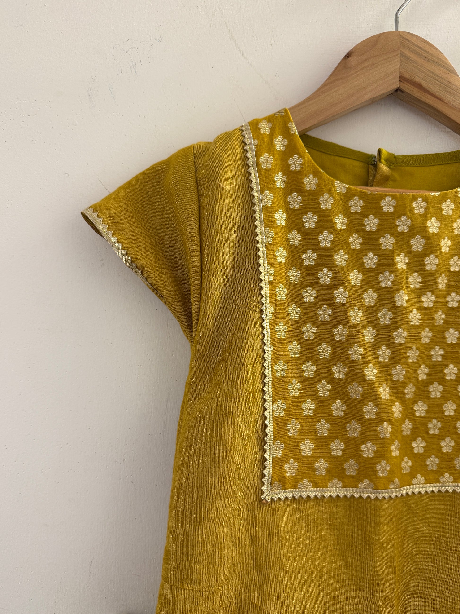 A bright and breezy festive set in sunshine yellow, featuring a Chanderi tissue A-line kurta with a delicate lurex yoke patch that adds a subtle festive shimmer. It’s paired with a soft, crushed cotton skirt with a gentle flare and zari lace detailing at the hem. Perfect for the festive season, this airy and elegant ensemble blends traditional charm with effortless comfort — ideal for twirling through celebrations in style.