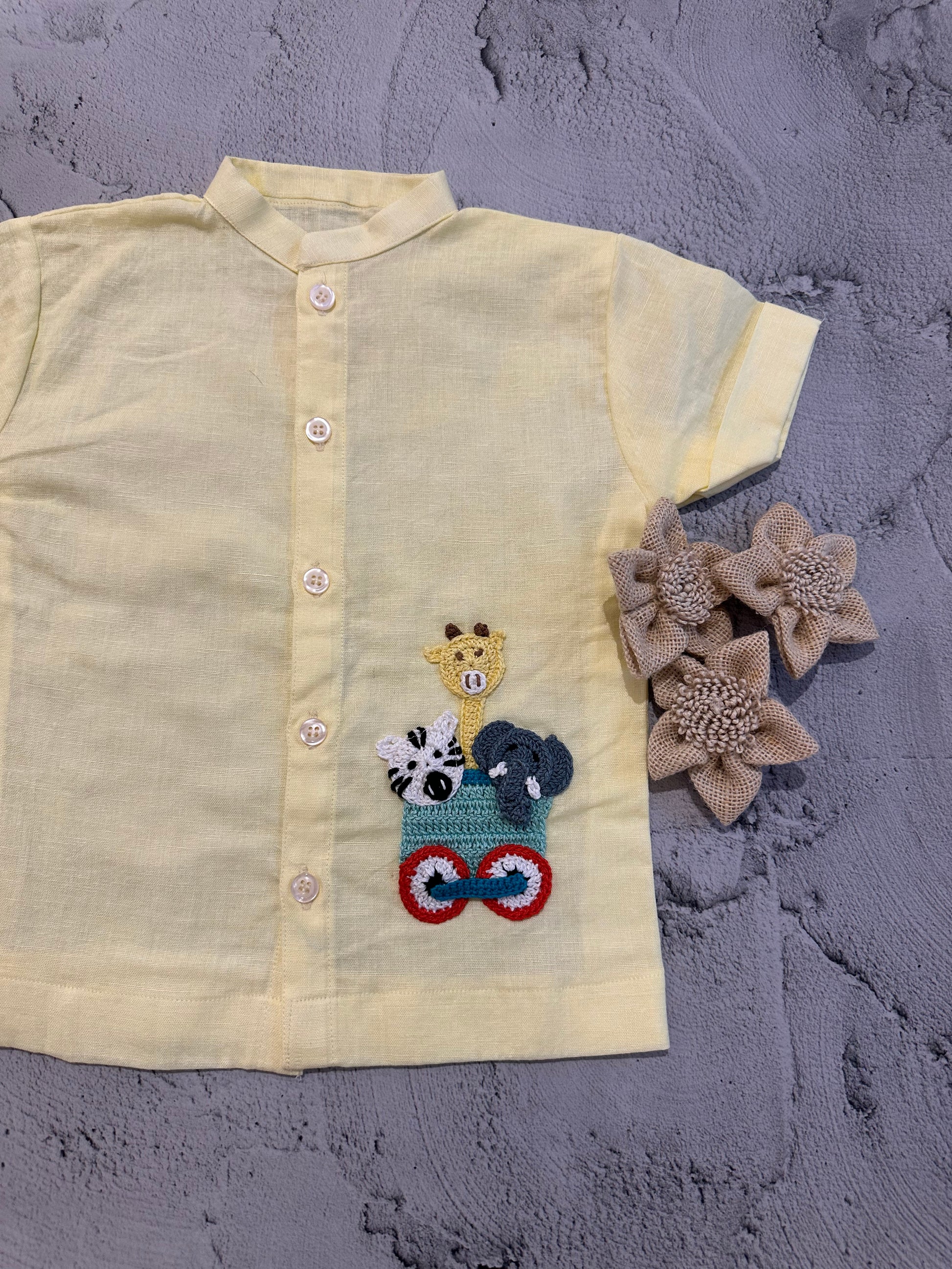 This light yellow cotton linen shirt from our Yarn Collection features a whimsical crochet cartwheel filled with adorable animals — a playful piece that tells a story in every stitch.